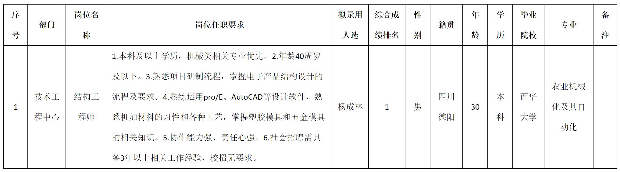 根据四川九洲光电科技股份有限公司发布的招聘公告及招聘相关规定,经测试、考察、体检等程序,拟录用杨成林同志到四川九洲光电科技股份有限公司工作,现予以公示,具体情况如下: