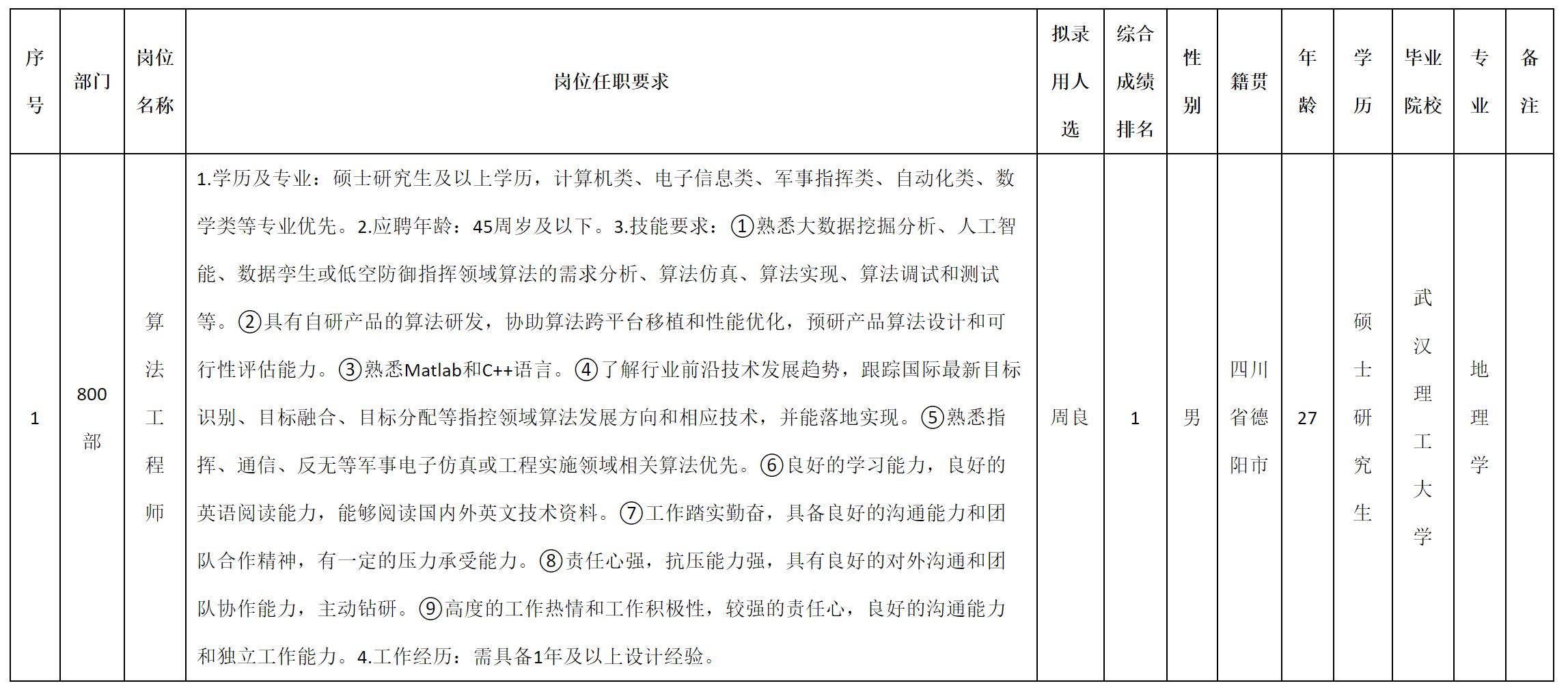 根据四川九洲电器集团有限责任公司发布的招聘公告及招聘相关规定,经测试、考察、体检等程序,拟录用周良同志到四川九洲电器集团有限责任公司工作,现予以公示,具体情况如下: