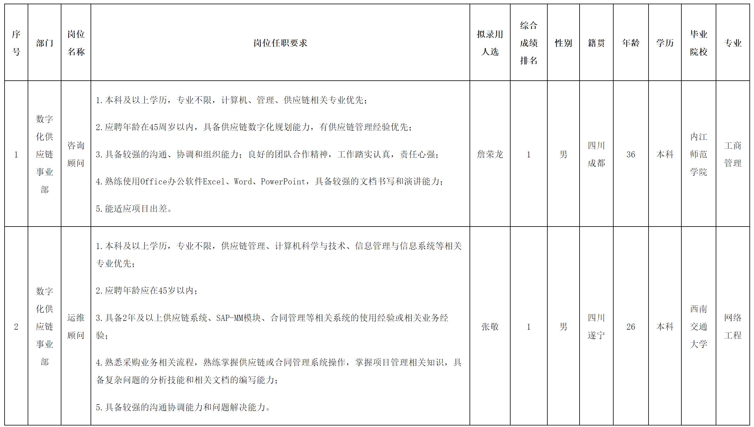根据四川虹信软件股份有限公司发布的招聘公告及招聘相关规定,经测试、考察、体检等程序,拟录用詹荣龙、张敬同志到四川虹信软件股份有限公司工作,现予以公示,具体情况如下: