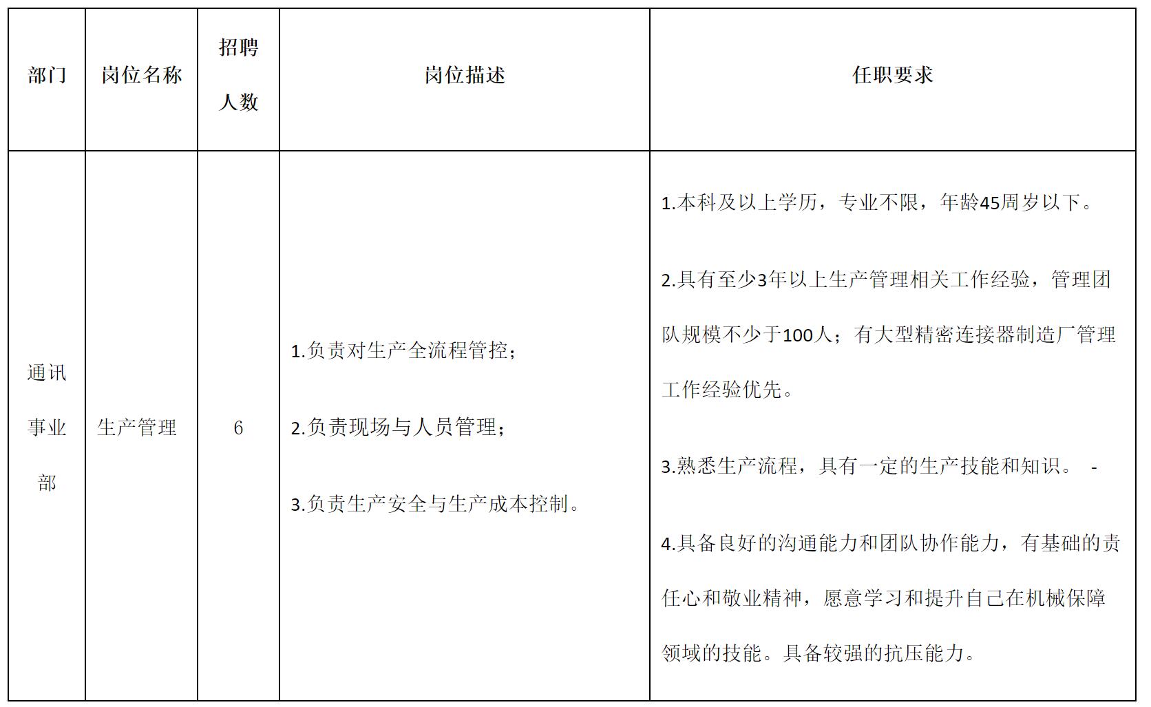 现因公司经营发展需要,现面向长虹控股集团内、外部诚聘生产管理岗位人员,具体岗位招聘信息公告如下: