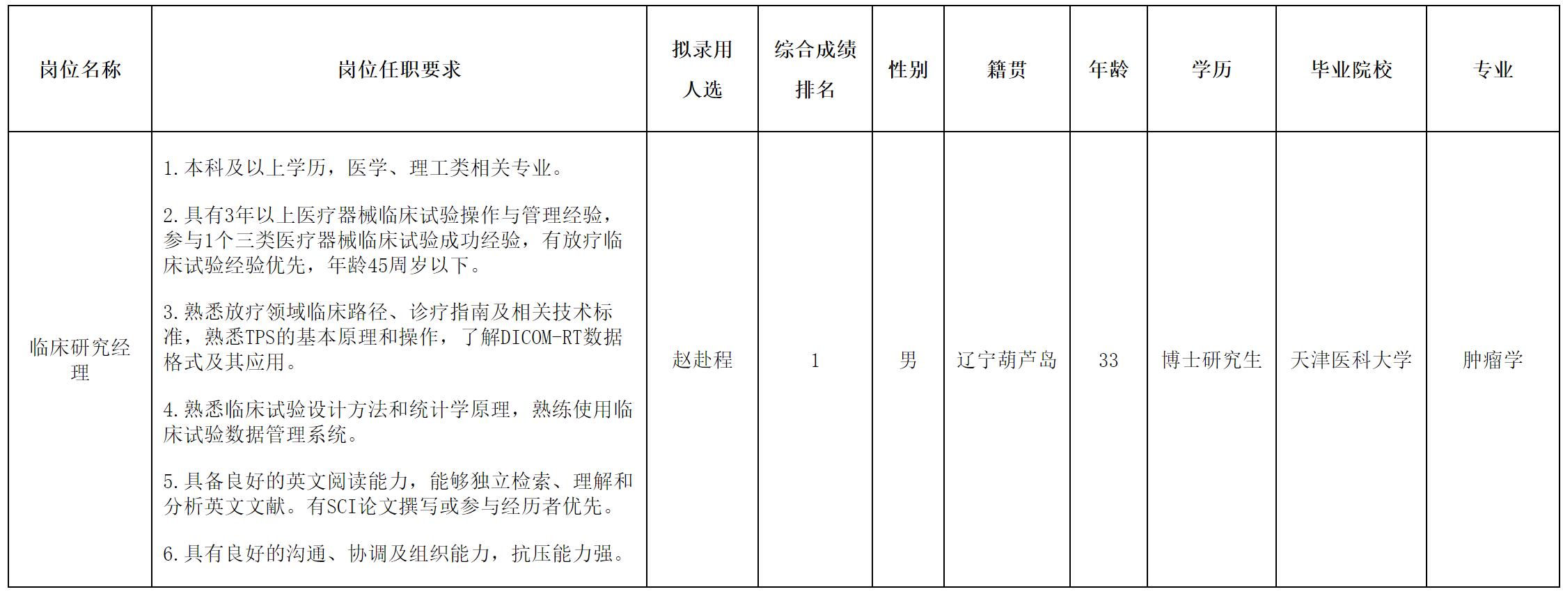 根据中玖闪光医疗科技有限公司发布的招聘公告及招聘相关规定,经面试、考察、体检等程序,拟录用赵赴程同志到中玖闪光医疗科技有限公司工作,现予以公示,具体情况如下: