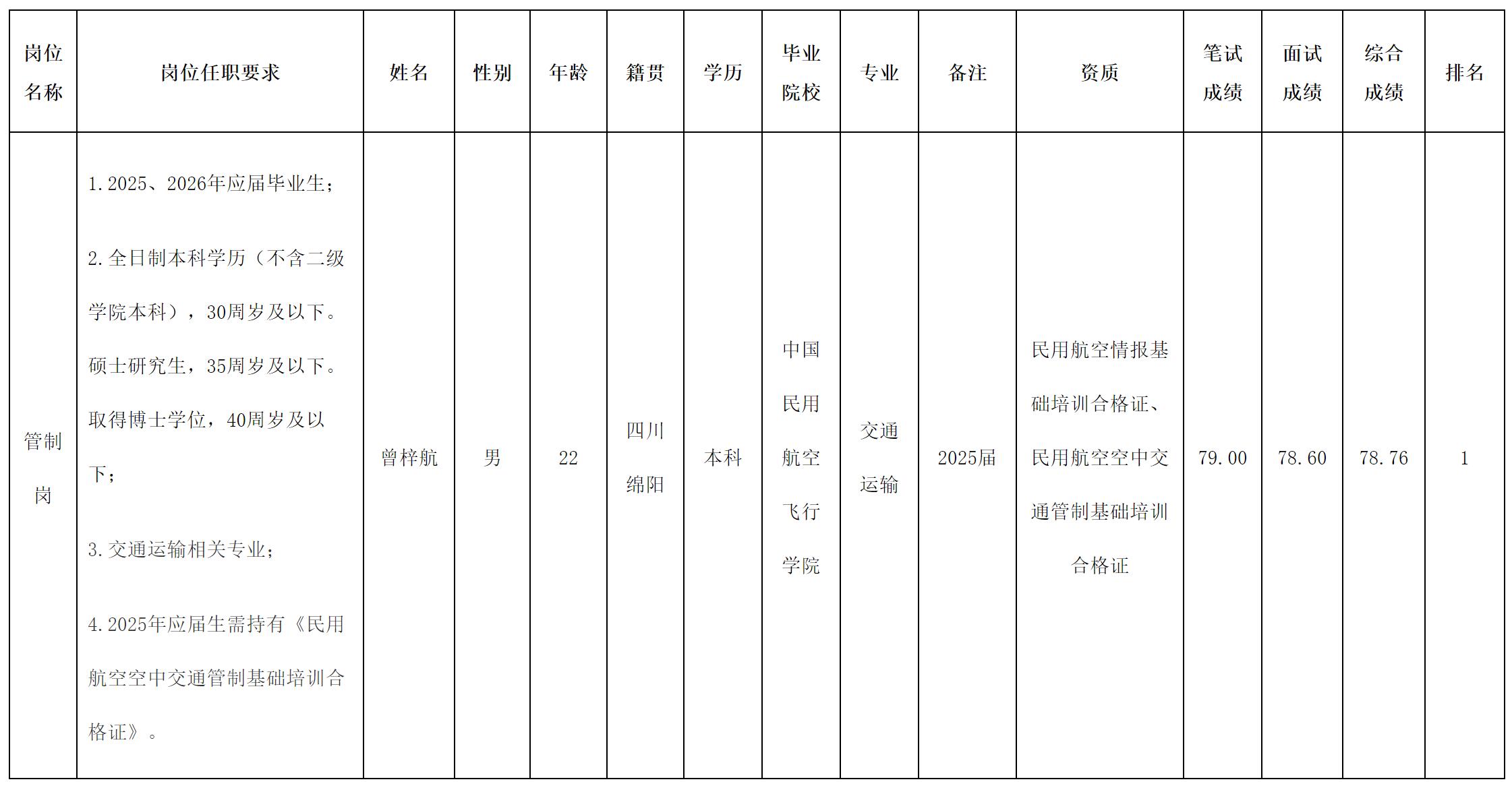 根据绵阳机场(集团)有限公司2025年10月发布的《关于2025年秋季招聘管制岗位的公告》以及招聘相关规定,经笔试、面试、背景调查、体检、心理测试等程序,拟录用曾梓航为绵阳机场(集团)有限公司职工,现予以公示,具体情况如下: