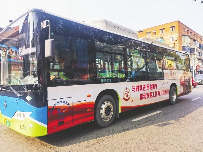 “双拥主题公交”不仅是交通工具,更是流动的“双拥宣传站”。车身两侧印有“同呼吸,共命运,心连心,军民团结一家亲”“与时俱进,军地携手,推动双拥工作再上新台阶”等宣传标语,车厢内“军人优先”等标识醒目,让群众在日常出行中感受爱国拥军氛围。
