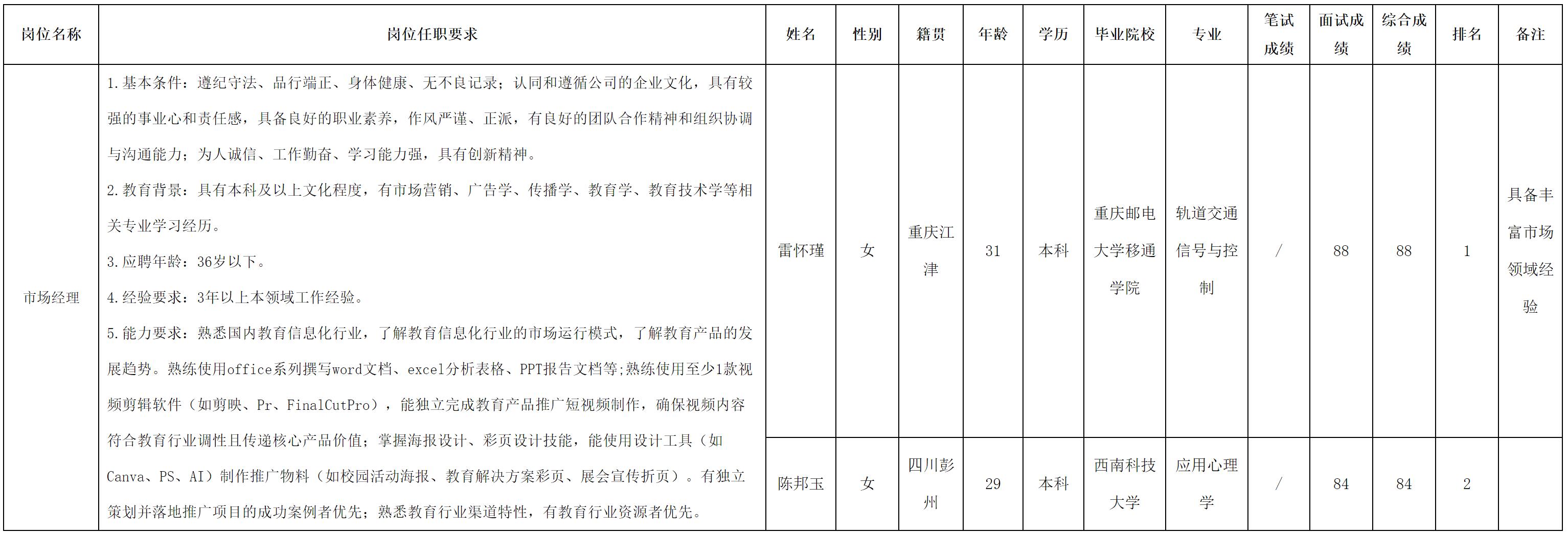 根据四川长虹教育科技有限公司发布的招聘公告及招聘相关规定,现将测试成绩予以公示。