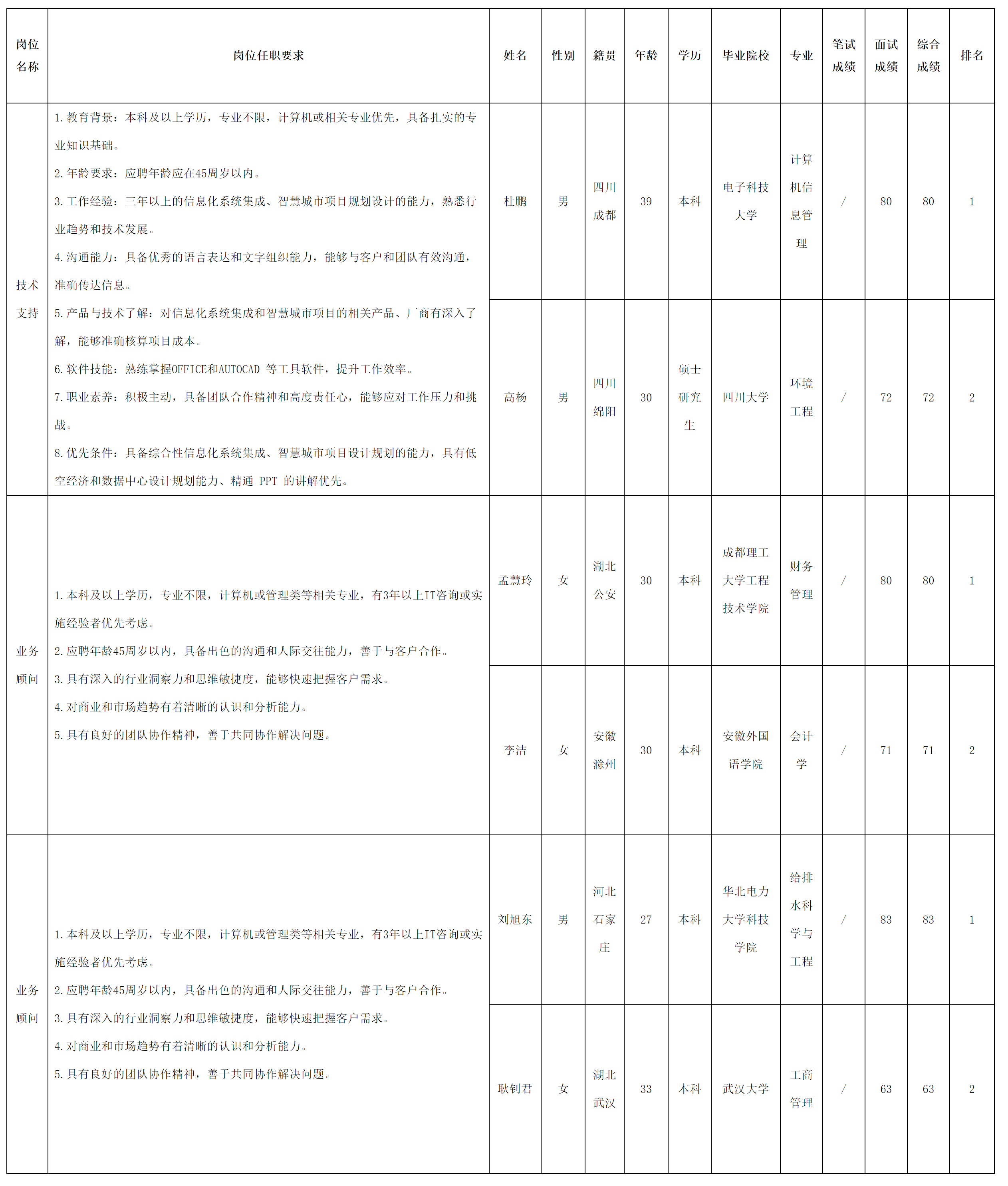 根据四川虹信软件股份有限公司发布的招聘公告及招聘相关规定,现将测试成绩予以公示。