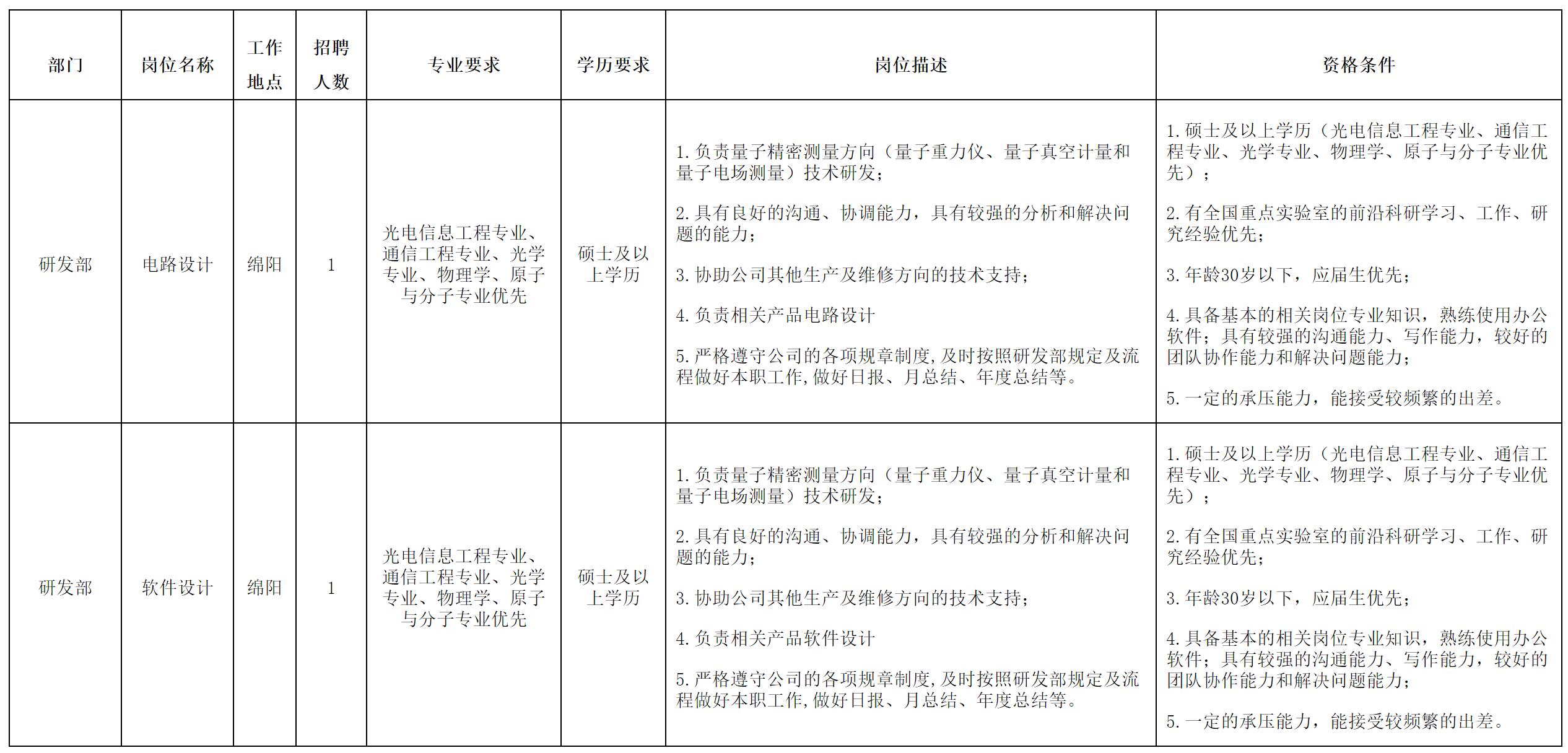 四川长虹电子科技有限公司(国营第七八〇厂)始建于1958年,是国家“一五”期间的156个重点项目之一,是我国第一个机载火控雷达科研生产基地,位于绵阳市经济技术开发区。公司注册资本1.7亿元人民币,为国有独资企业。公司以高端光电仪器和高端光电装备为主线,主要从事重力测量、光电探测和光电告警领域产品研发和生产。因业务发展需要,现诚聘英才,招聘岗位及要求如下: