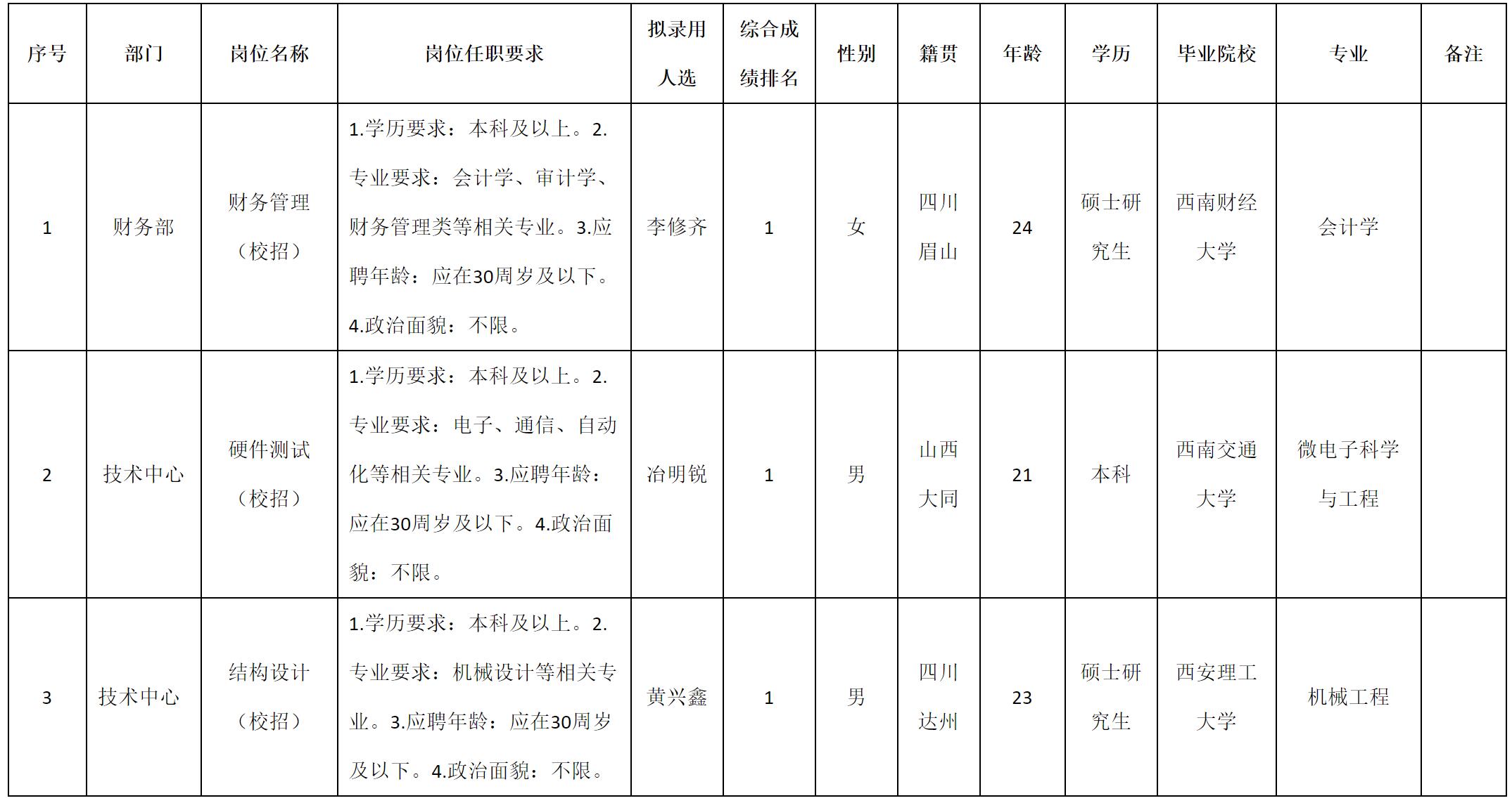 根据四川九州电子科技股份有限公司发布的招聘公告及招聘相关规定,经测试、考察、体检等程序,拟录用李修齐等3名同志到四川九州电子科技股份有限公司工作,现予以公示,具体情况如下:
