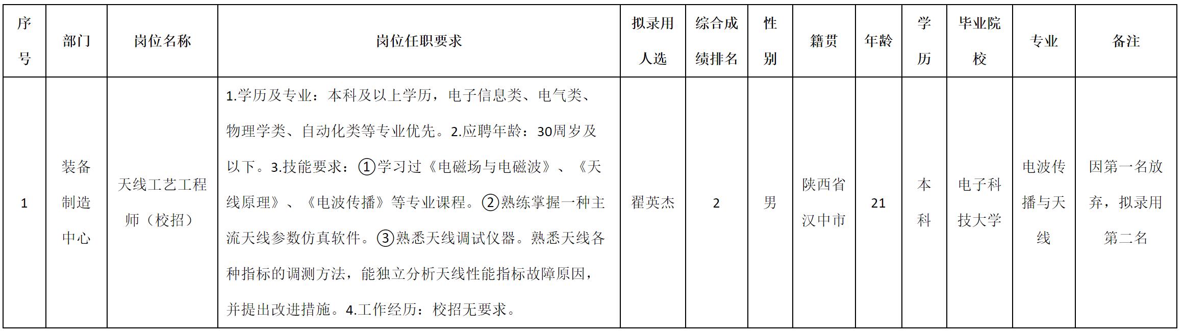根据四川九洲电器集团有限责任公司发布的招聘公告及招聘相关规定,经测试、考察、体检等程序,拟录用翟英杰同志到四川九洲电器集团有限责任公司工作,现予以公示,具体情况如下: