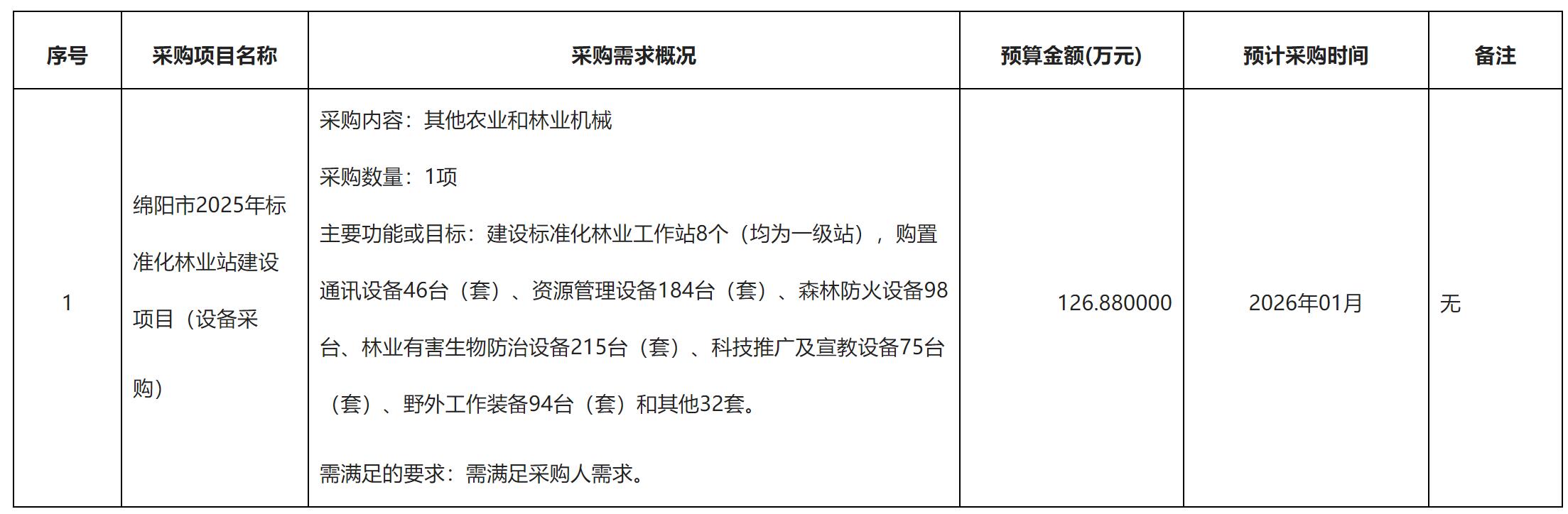 为便于供应商及时了解政府采购信息,根据《财政部关于开展政府采购意向公开工作的通知》(财库〔2020〕10号)等有关规定,现将绵阳市林业局2025年度政府采购意向公告(第4批)采购意向公开如下: