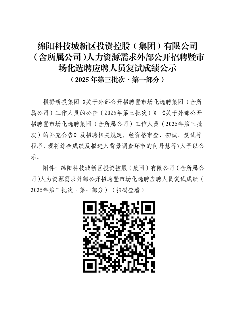 绵阳科技城新区投资控股(集团)有限公司(含所属公司)人力资源需求外部公开招聘暨市场化选聘应聘人员复试成绩公示(2025年第三批次·第一部分)