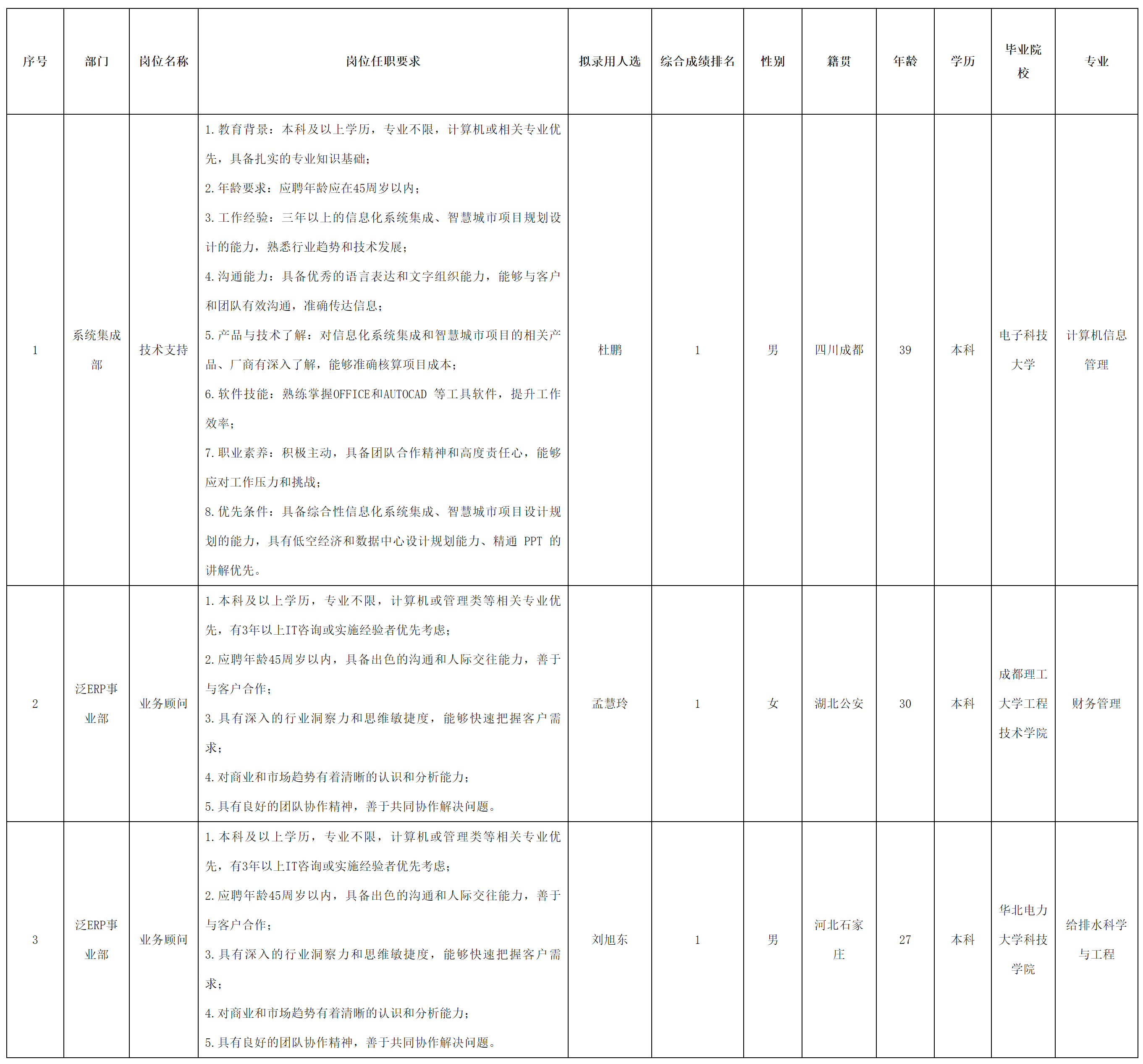 根据四川虹信软件股份有限公司发布的招聘公告及招聘相关规定,经测试、考察、体检等程序,拟录用杜鹏、孟慧玲、刘旭东同志到四川虹信软件股份有限公司工作,现予以公示,具体情况如下: