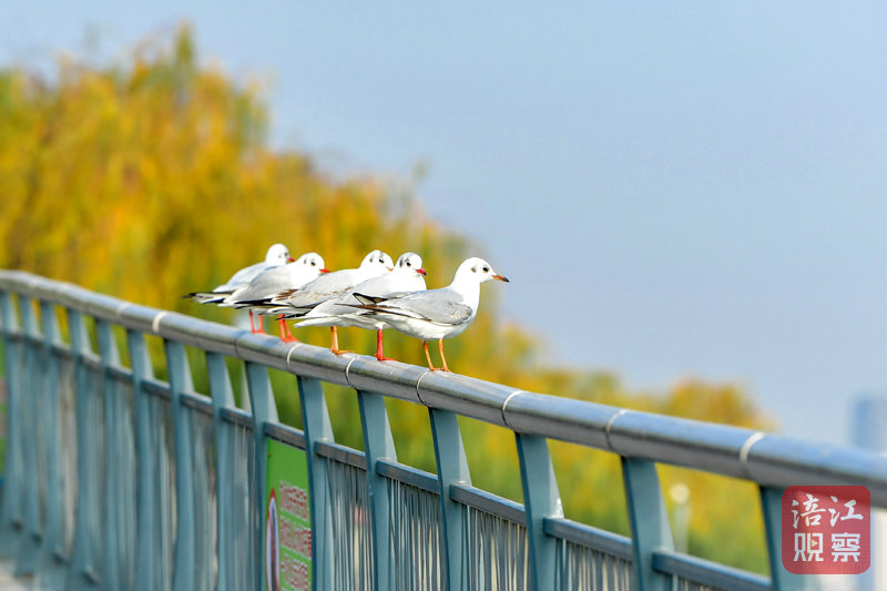 红嘴鸥栖息在湖岸的栏杆上,悠闲地晒着太阳,偶尔展开洁白的羽翼,轻声鸣叫,仿佛在享受这难得的温暖时光。