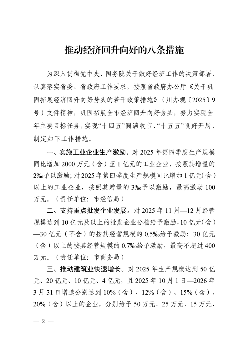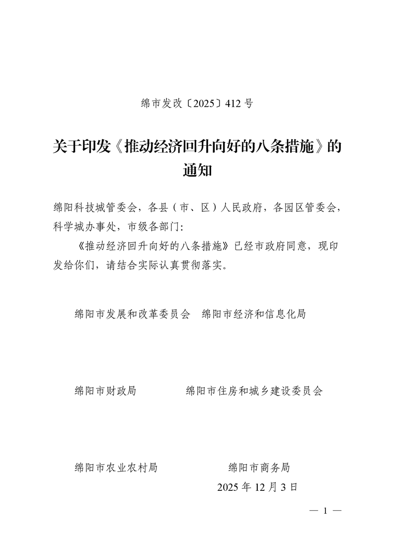 绵阳市发展和改革委员会 绵阳市经济和信息化局 绵阳市财政局 绵阳市住房和城乡建设委员会 绵阳市农业农村局 绵阳市商务局 关于印发《推动经济回升向好的八条措施》的通知