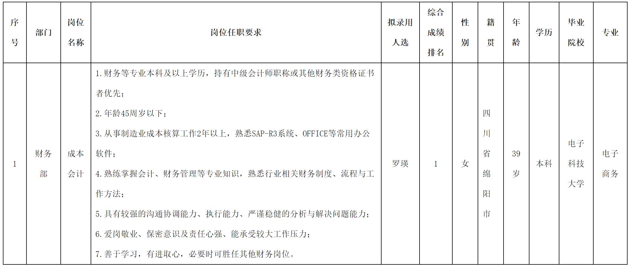 根据四川爱联科技股份有限公司发布的招聘公告及招聘相关规定,经面试、考察、体检等程序,拟录用罗瑛同志到财务部工作,现予以公示,具体情况如下: