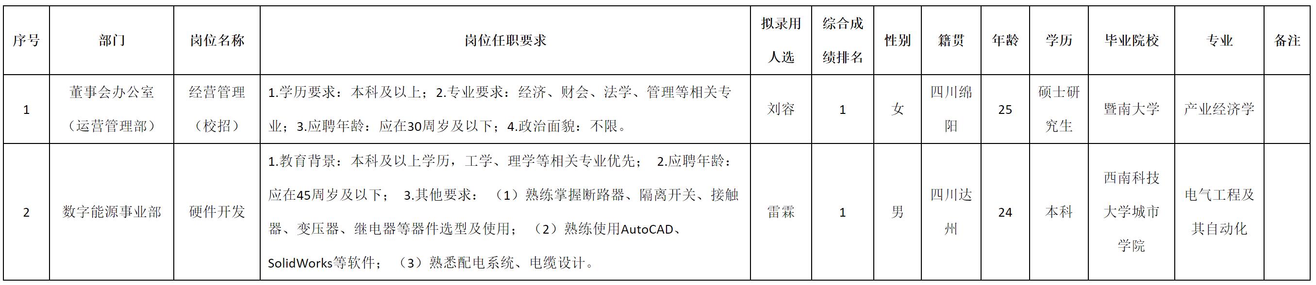 根据四川九州电子科技股份有限公司发布的招聘公告及招聘相关规定,经测试、考察、体检等程序,拟录用刘容等2名同志到四川九州电子科技股份有限公司工作,现予以公示,具体情况如下: