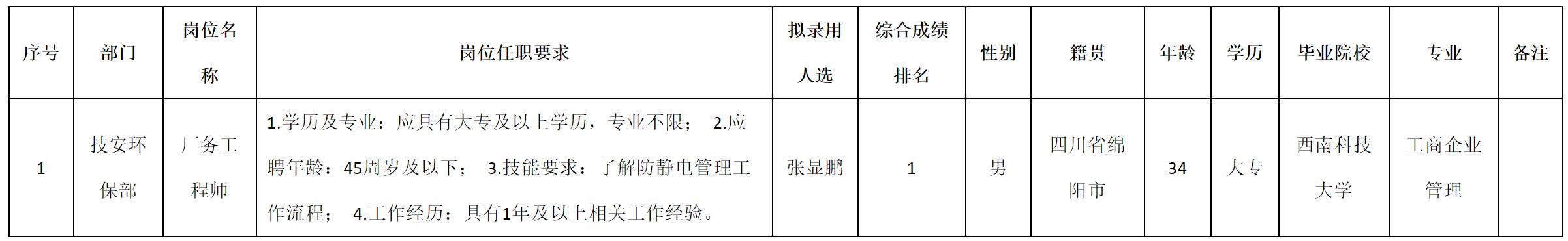 根据四川九州光电子技术有限公司发布的招聘公告及招聘相关规定,经测试、考察、体检等程序,拟录用张显鹏同志到四川九州光电子技术有限公司工作,现予以公示,具体情况如下: