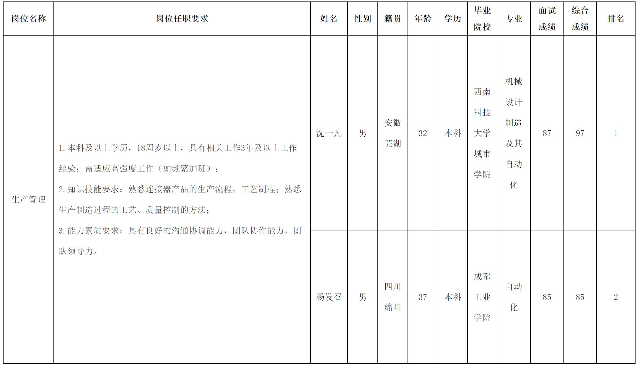 根据四川华丰科技股份有限公司发布的招聘公告及招聘相关规定,现将测试成绩予以公示。