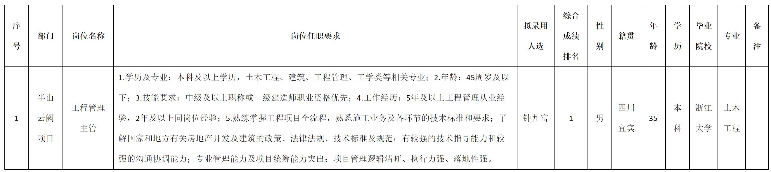 根据九洲千城置业有限责任公司发布的招聘公告及招聘相关规定,经测试、考察、体检等程序,拟录用钟九富同志到九洲千城置业有限责任公司工作,现予以公示,具体情况如下:
