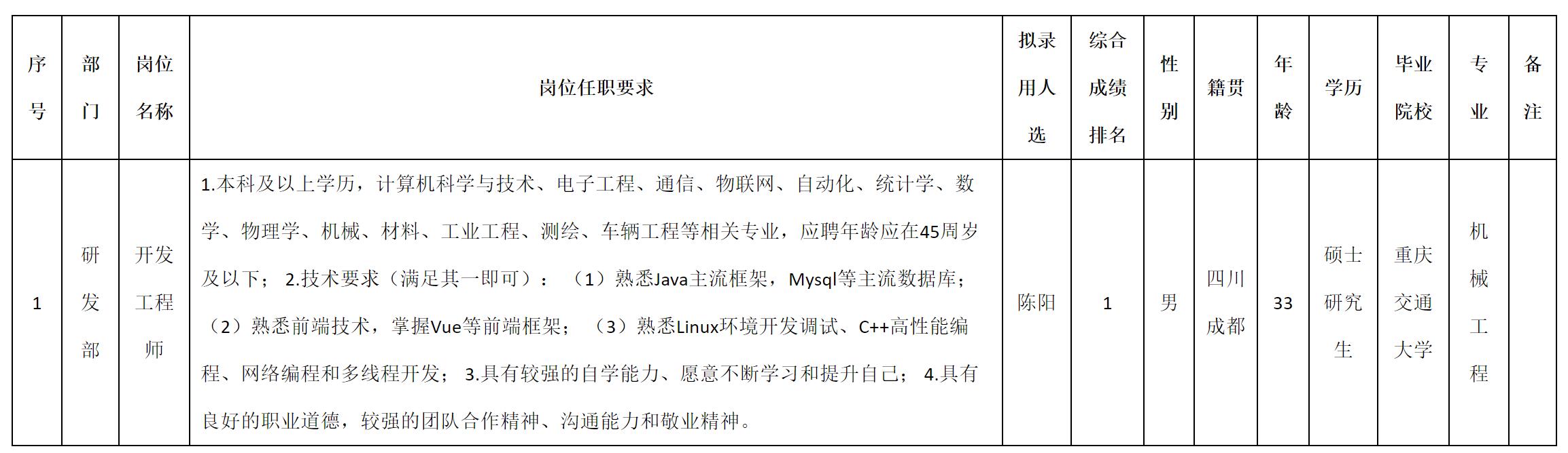 根据四川九洲投资控股集团有限公司软件与数据智能军团发布的招聘公告及招聘相关规定,经测试、考察、体检等程序,拟录用陈阳同志到四川九洲投资控股集团有限公司软件与数据智能军团工作,现予以公示,具体情况如下: