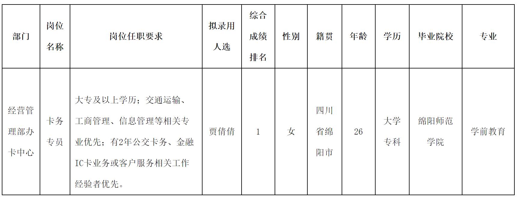 根据绵阳市绵州通科技有限责任公司发布的招聘公告及招聘相关规定,经笔试、面试、体检等程序,拟录用贾倩倩到绵阳市绵州通科技有限责任公司工作,现予以公示,具体情况如下: