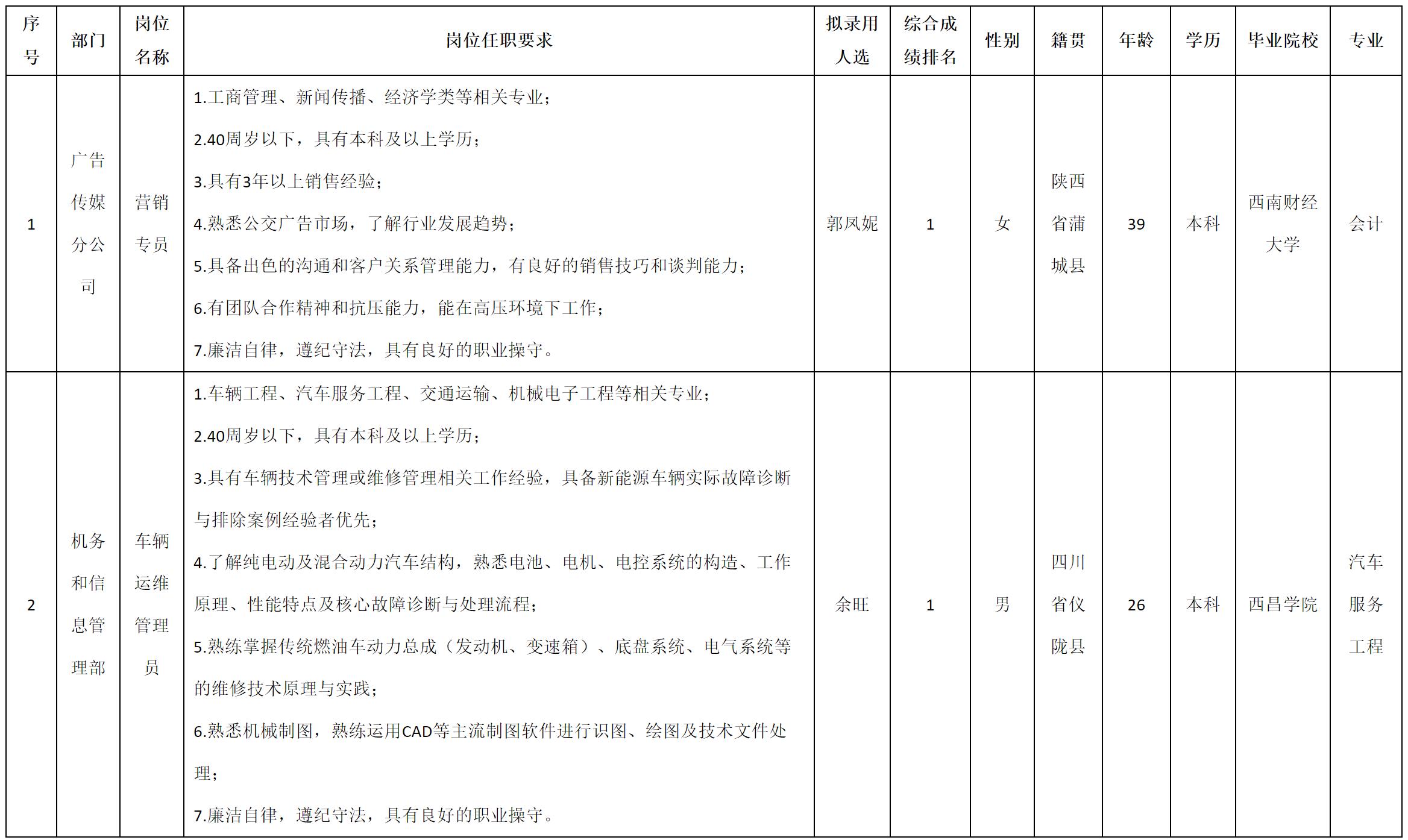 根据绵阳市公共交通集团有限责任公司发布的招聘公告及招聘相关规定,经笔试、面试、考察、体检等程序,拟录用余旺等同志到绵阳市公共交通集团有限责任公司工作,现予以公示,具体情况如下: