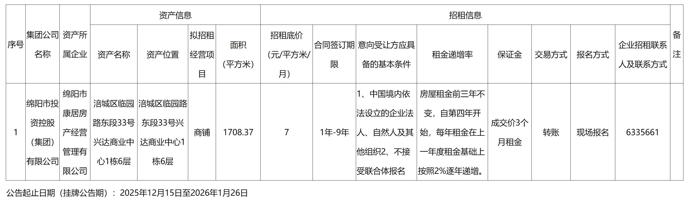 绵阳市康居房产经营管理有限公司资产出租公告