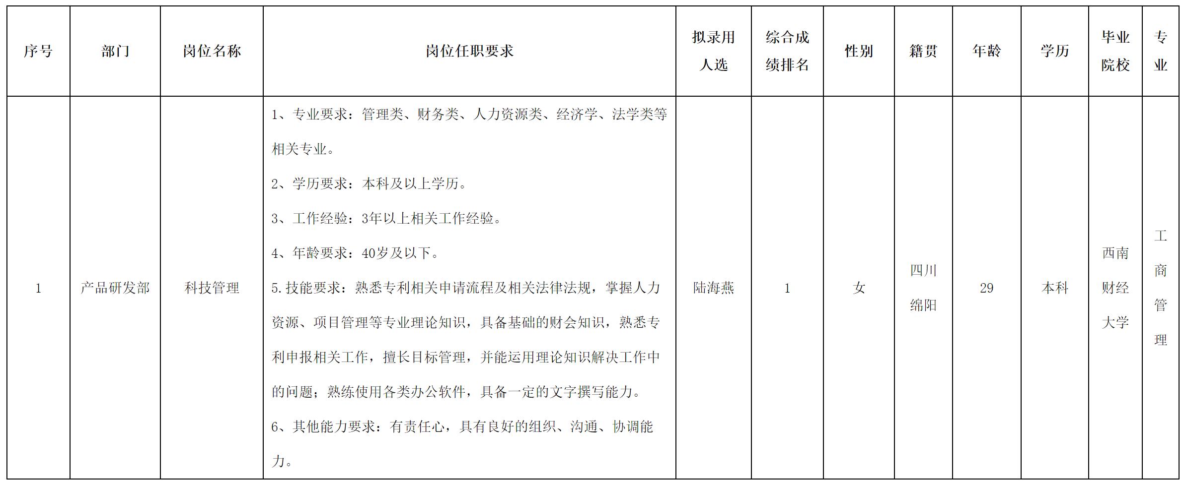 根据四川爱创科技有限公司发布的招聘公告及招聘相关规定,经面试、考察、体检等程序,拟录用陆海燕同志到产品研发部工作,现予以公示,具体情况如下: