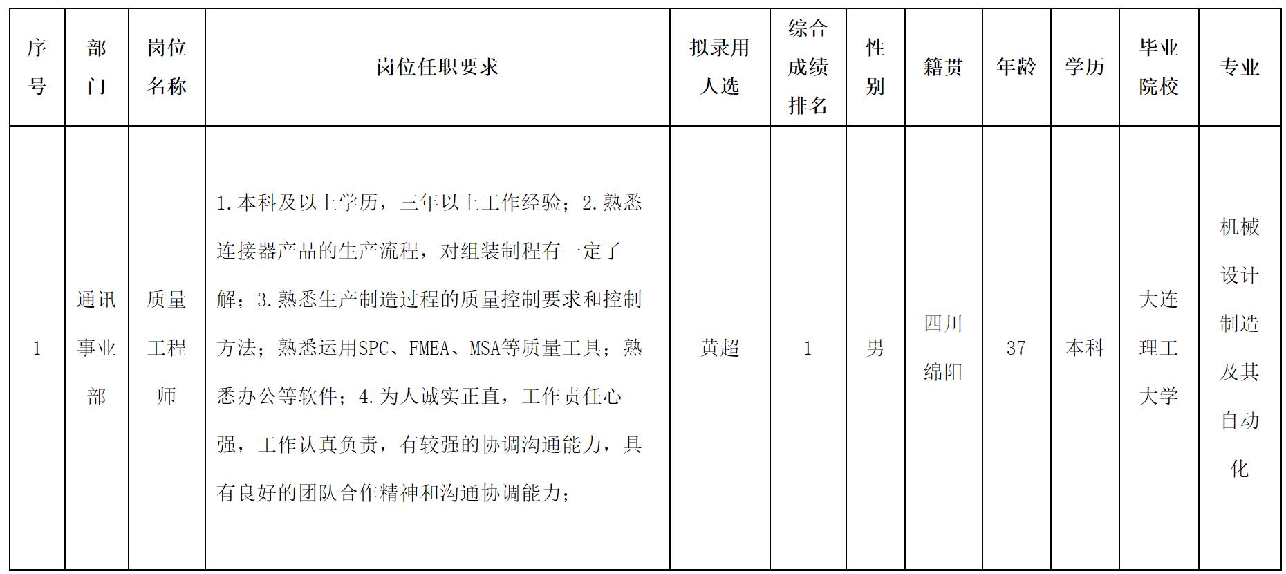 根据四川华丰科技股份有限公司发布的招聘公告及招聘相关规定,经测试等程序,拟录用黄超等同志到四川华丰科技股份有限公司工作,现予以公示,具体情况如下: