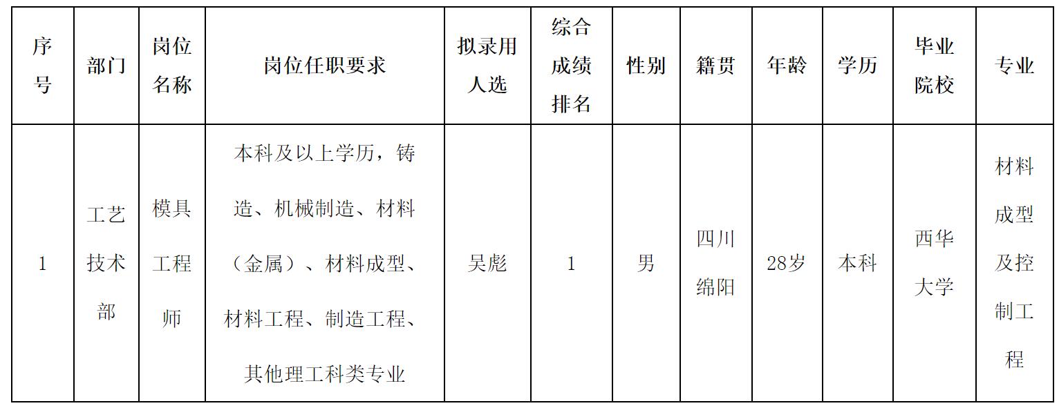 根据四川波鸿实业有限公司发布的招聘公告及招聘相关规定,经面试、体检等程序,拟录用吴彪同志到四川威斯卡特工业有限公司绵阳分公司工作,现予以公示,具体情况如下: