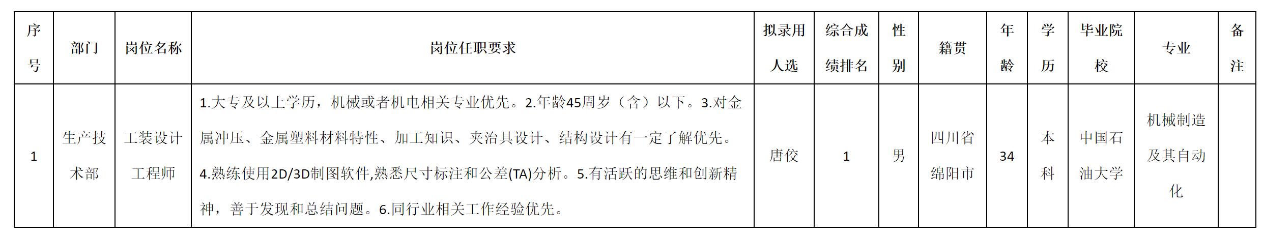 根据四川安和精密电子电器股份有限公司发布的招聘公告及招聘相关规定,经测试、考察、体检等程序,拟录用唐佼同志到四川安和精密电子电器股份有限公司工作,现予以公示,具体情况如下: