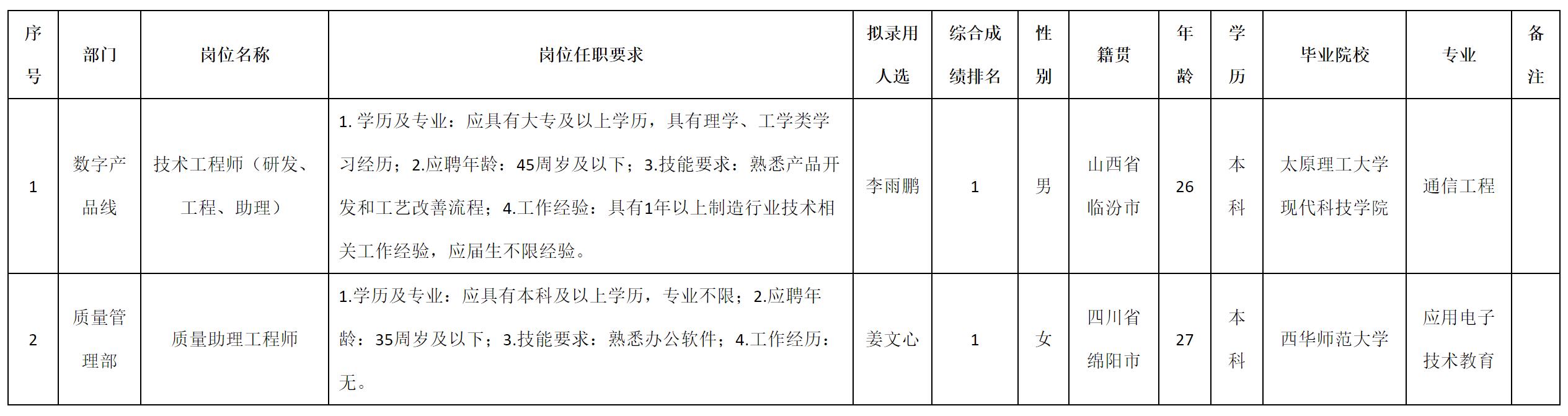 根据四川九州光电子技术有限公司发布的招聘公告及招聘相关规定,经测试、考察、体检等程序,拟录用李雨鹏等2名同志到四川九州光电子技术有限公司工作,现予以公示,具体情况如下: