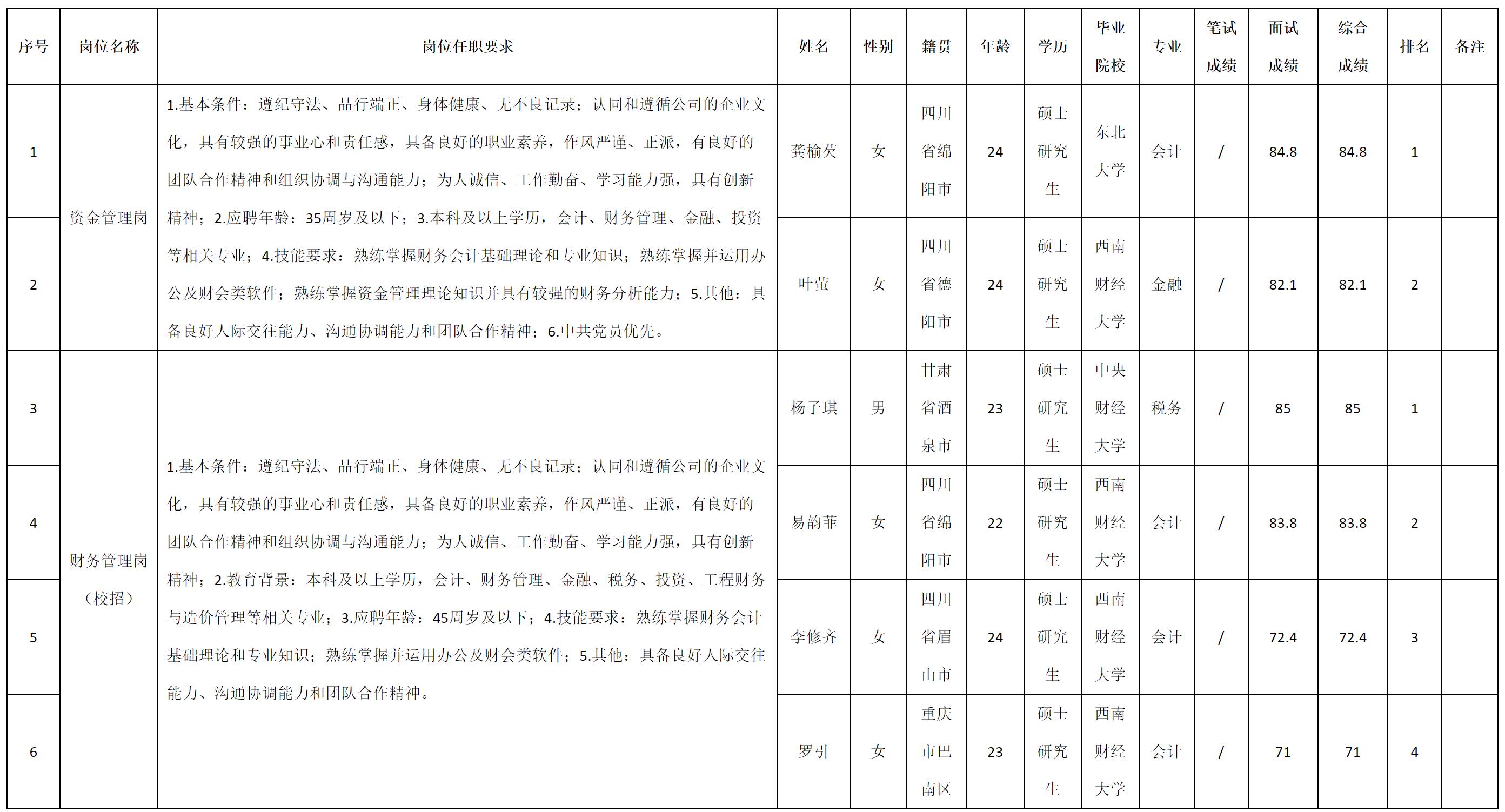 根据四川九洲投资控股集团有限公司发布的招聘公告及招聘相关规定,现将测试成绩予以公示。