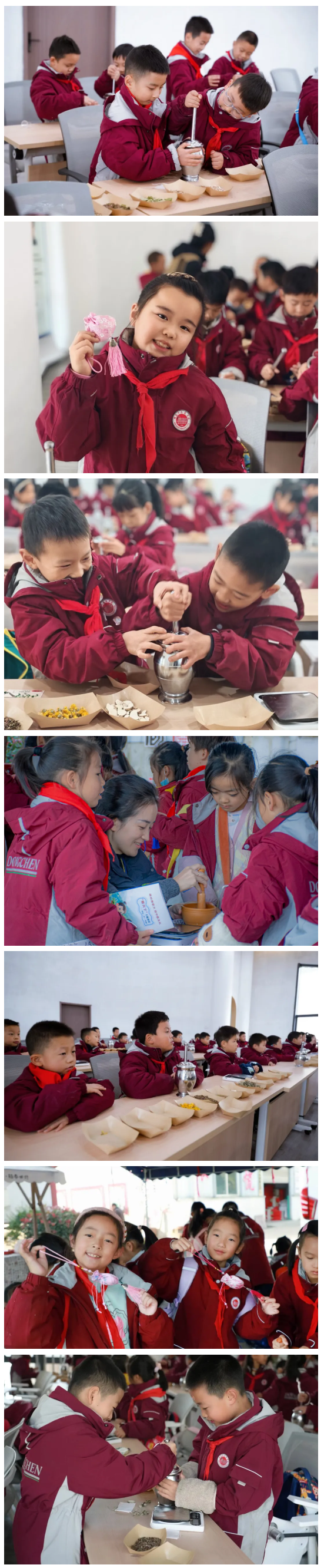 “我的香囊里有艾叶和茉莉!”同学们学习不同药材的药性,并根据所学知识,亲手配制独一无二的中医药香囊。一折一叠间,不仅包裹了药材,更包裹了对健康的美好祝愿。