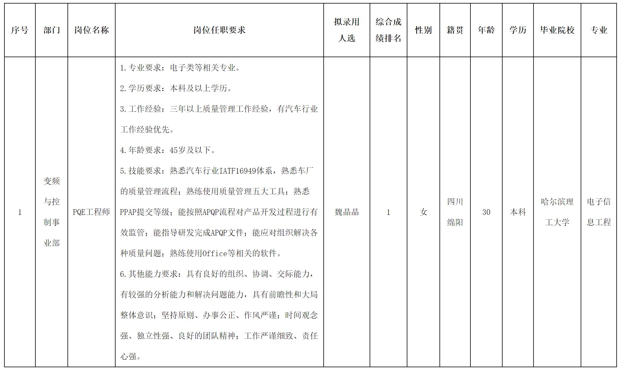 根据四川爱创科技有限公司发布的招聘公告及招聘相关规定,经面试、考察、体检等程序,拟录用魏晶晶同志到变频与控制事业部工作,现予以公示,具体情况如下: