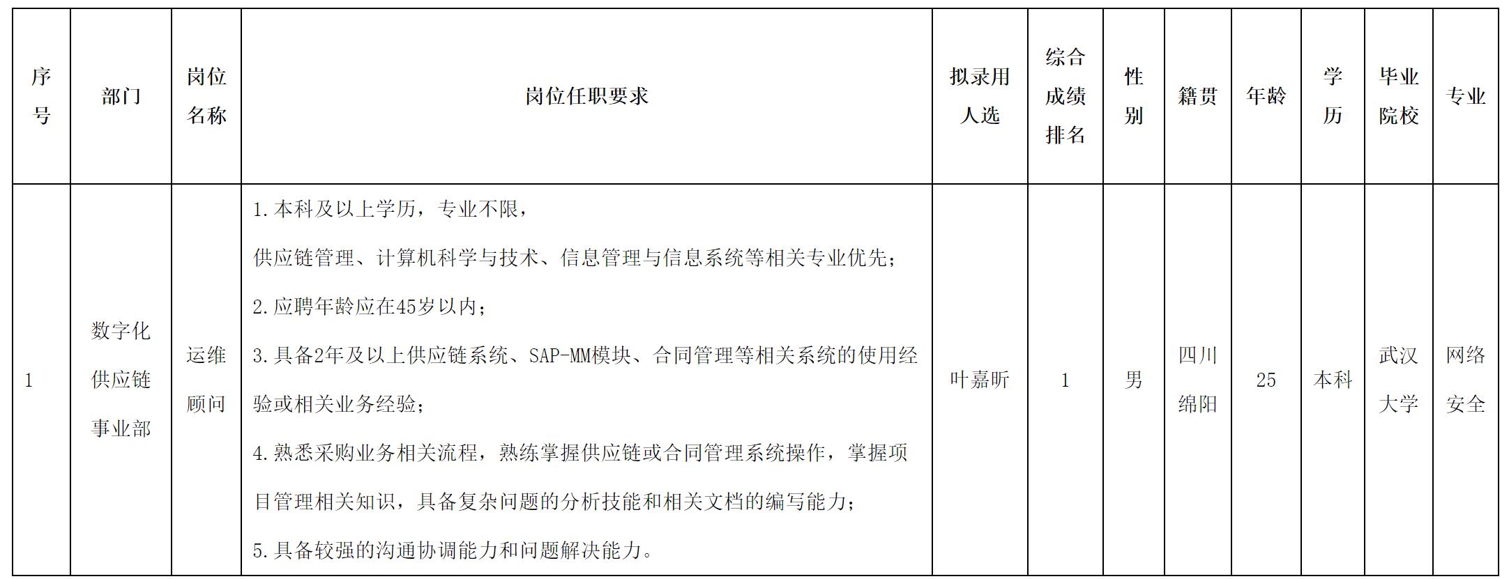 根据四川虹信软件股份有限公司发布的招聘公告及招聘相关规定,经测试、考察、体检等程序,拟录用叶嘉昕同志到四川虹信软件股份有限公司工作,现予以公示,具体情况如下: