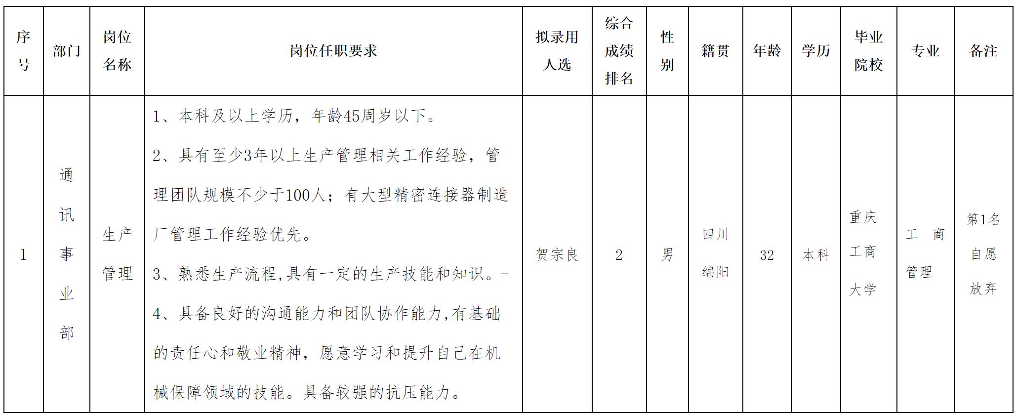 根据四川华丰科技股份有限公司发布的招聘公告及招聘相关规定,经测试等程序,拟录用贺宗良同志到四川华丰科技股份有限公司工作,现予以公示,具体情况如下: