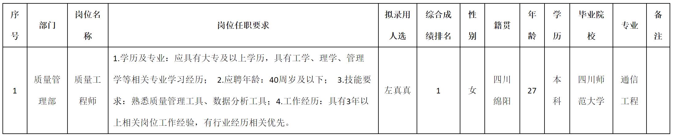 根据四川九华光子通信技术有限公司发布的招聘公告及招聘相关规定,经测试、考察、体检等程序,拟录用左真真同志到四川九华光子通信技术有限公司工作,现予以公示,具体情况如下: