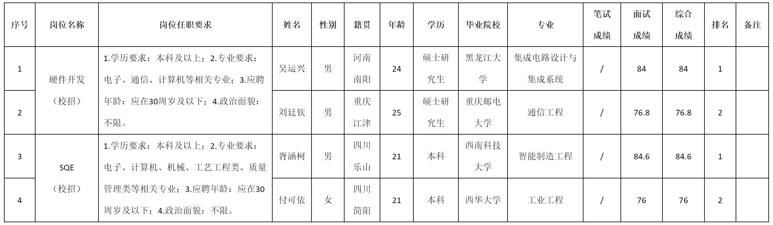 根据四川九州电子科技股份有限公司发布的招聘公告及招聘相关规定,现将测试成绩予以公示。