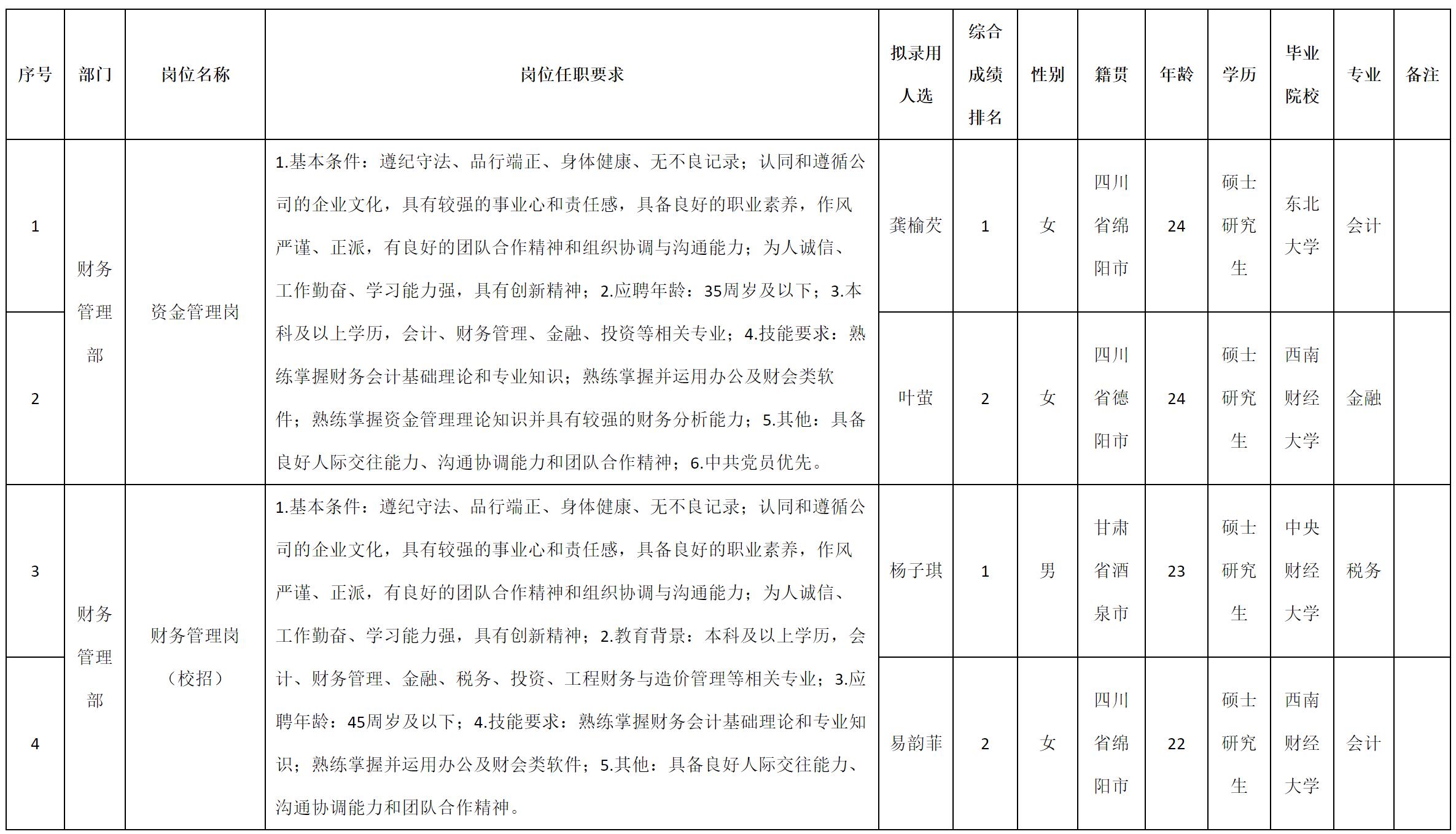 根据四川九洲投资控股集团有限公司发布的招聘公告及招聘相关规定,经测试、考察、体检等程序,拟录用龚榆芡等4名同志到四川九洲投资控股集团有限公司工作,现予以公示,具体情况如下: