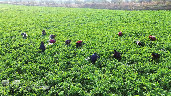 三台立新镇万宏源家庭农场油菜地里,农户正在采摘油菜薹。 记者 刘凤君 摄