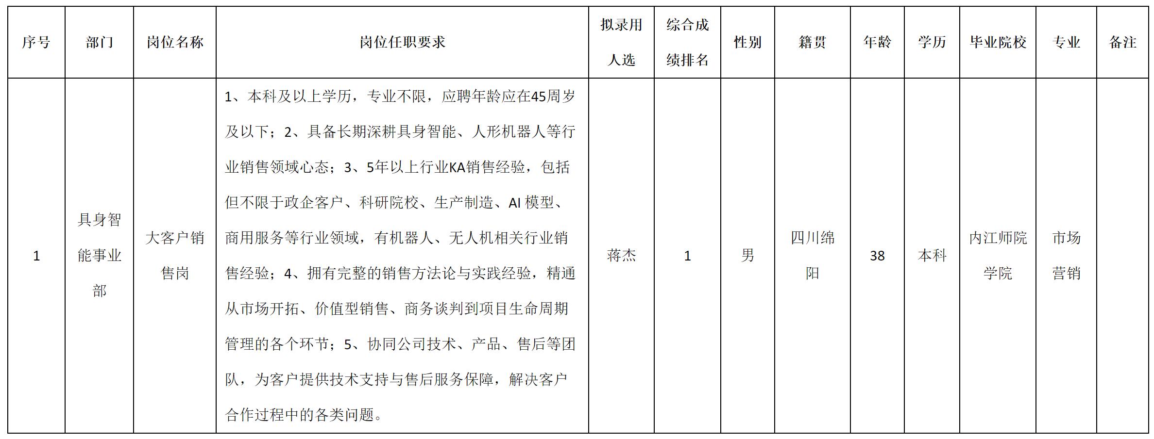 根据四川九洲投资控股集团有限公司软件与数据智能军团发布的招聘公告及招聘相关规定,经测试、考察、体检等程序,拟录用蒋杰同志到四川九洲投资控股集团有限公司软件与数据智能军团工作,现予以公示,具体情况如下: