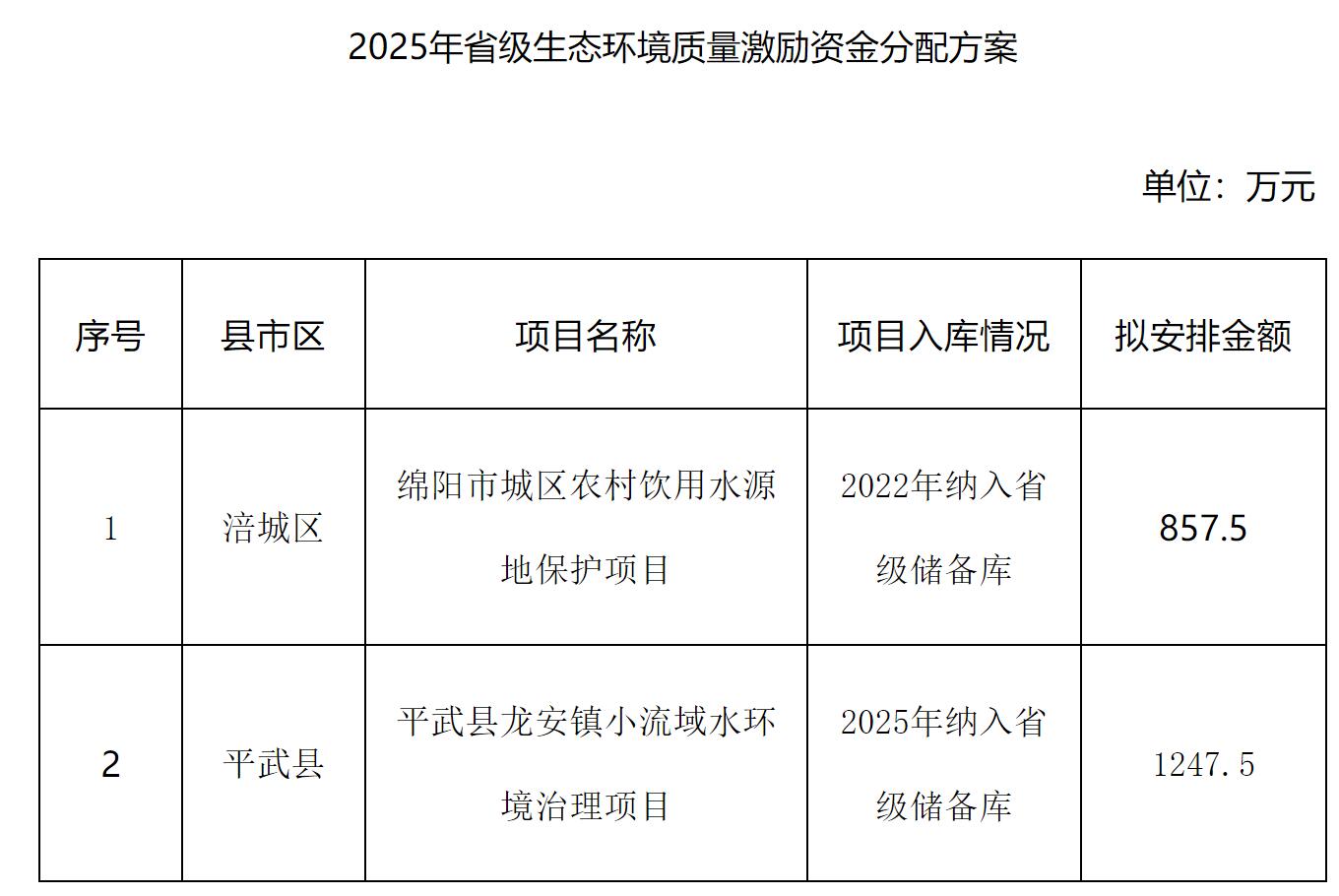 四川省财政厅、四川省生态环境厅以川财资环〔2025〕65号号下达我市2025年省级生态环境质量激励资金2105万元。根据“资金跟着项目走”的要求,我局选取央省储备库符合资金分配条件的项目,会同绵阳市财政局拟定了资金分配方案,现予以公示。