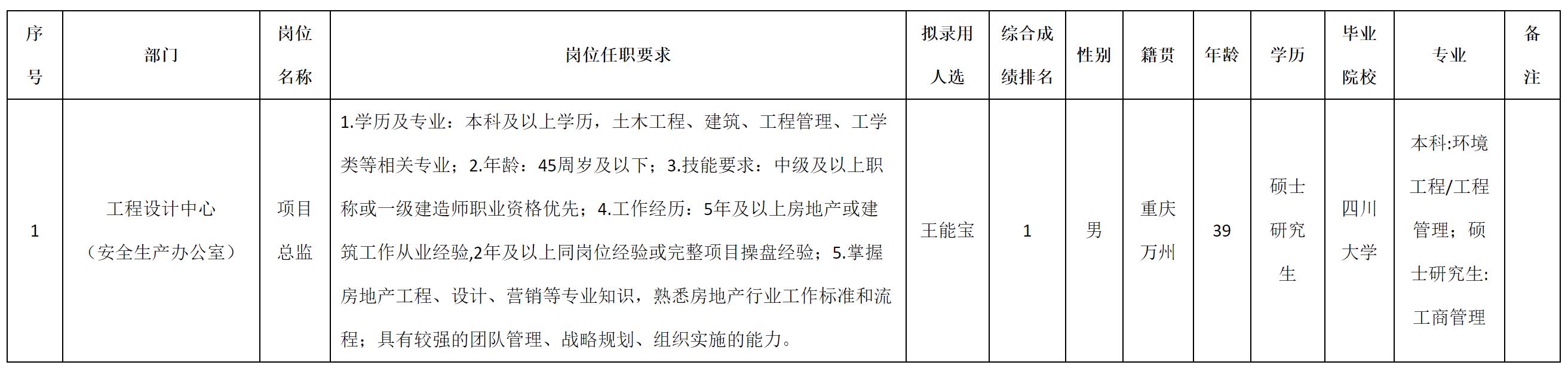 根据九洲千城置业有限责任公司发布的招聘公告及招聘相关规定,经测试、考察、体检等程序,拟录用王能宝同志到九洲千城置业有限责任公司工作,现予以公示,具体情况如下:
