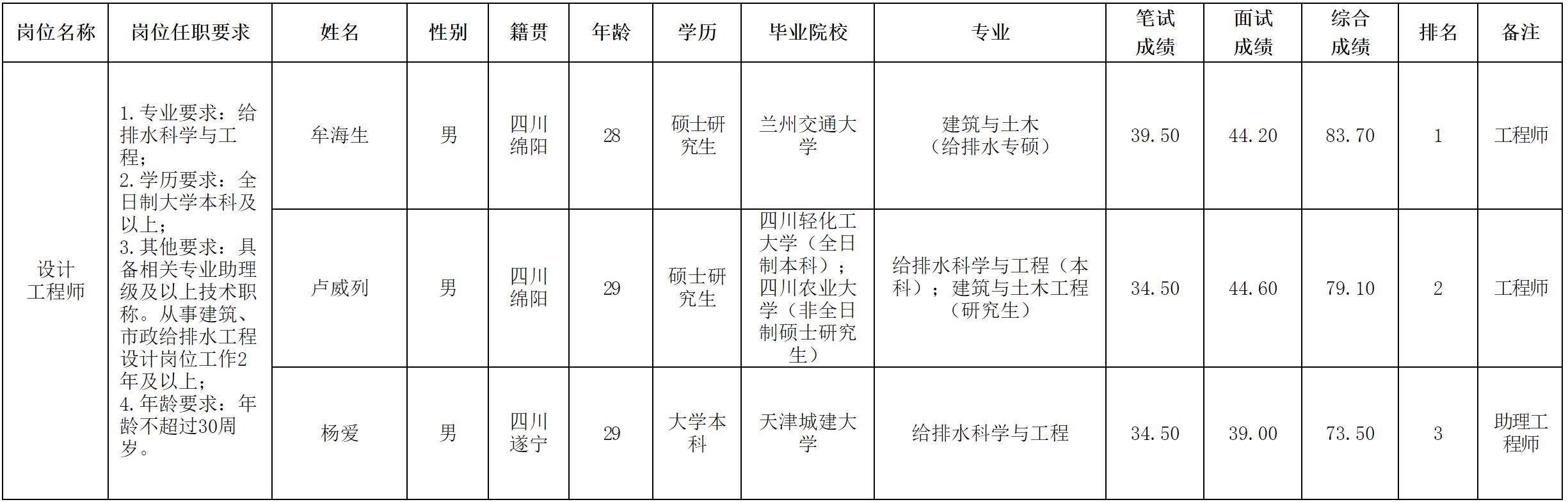 根据绵阳市水务(集团)有限公司发布的招聘公告及招聘相关规定,经笔试、面试等程序,现将笔试(面试)成绩予以公示。