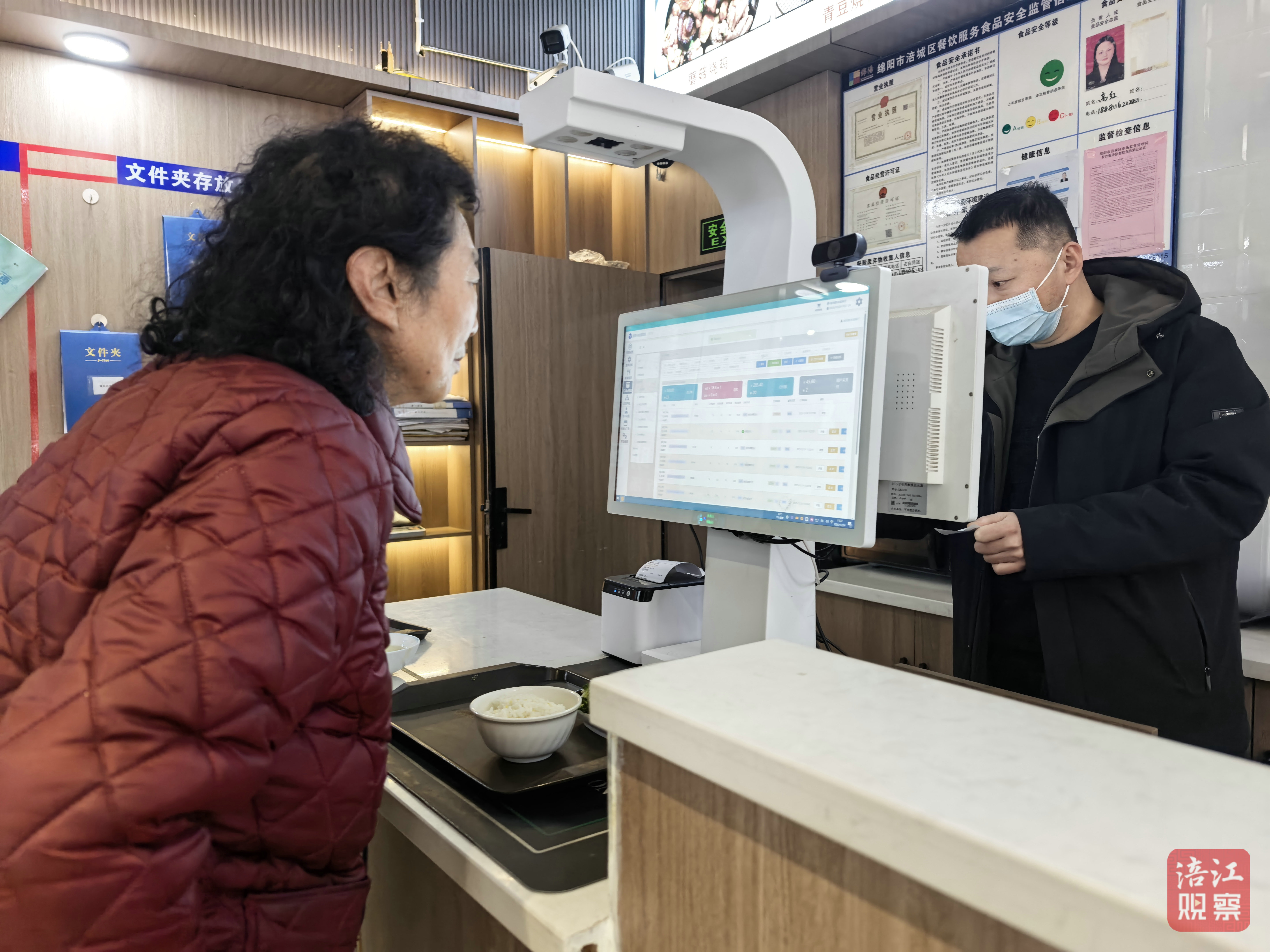 老人们沿着餐区挑选自己喜欢的菜品,工作人员则熟练地为他们打菜盛饭。选好饭菜后,老人们依次来到收银台前,通过人脸识别,系统自动计算补贴金额,并完成扣费。