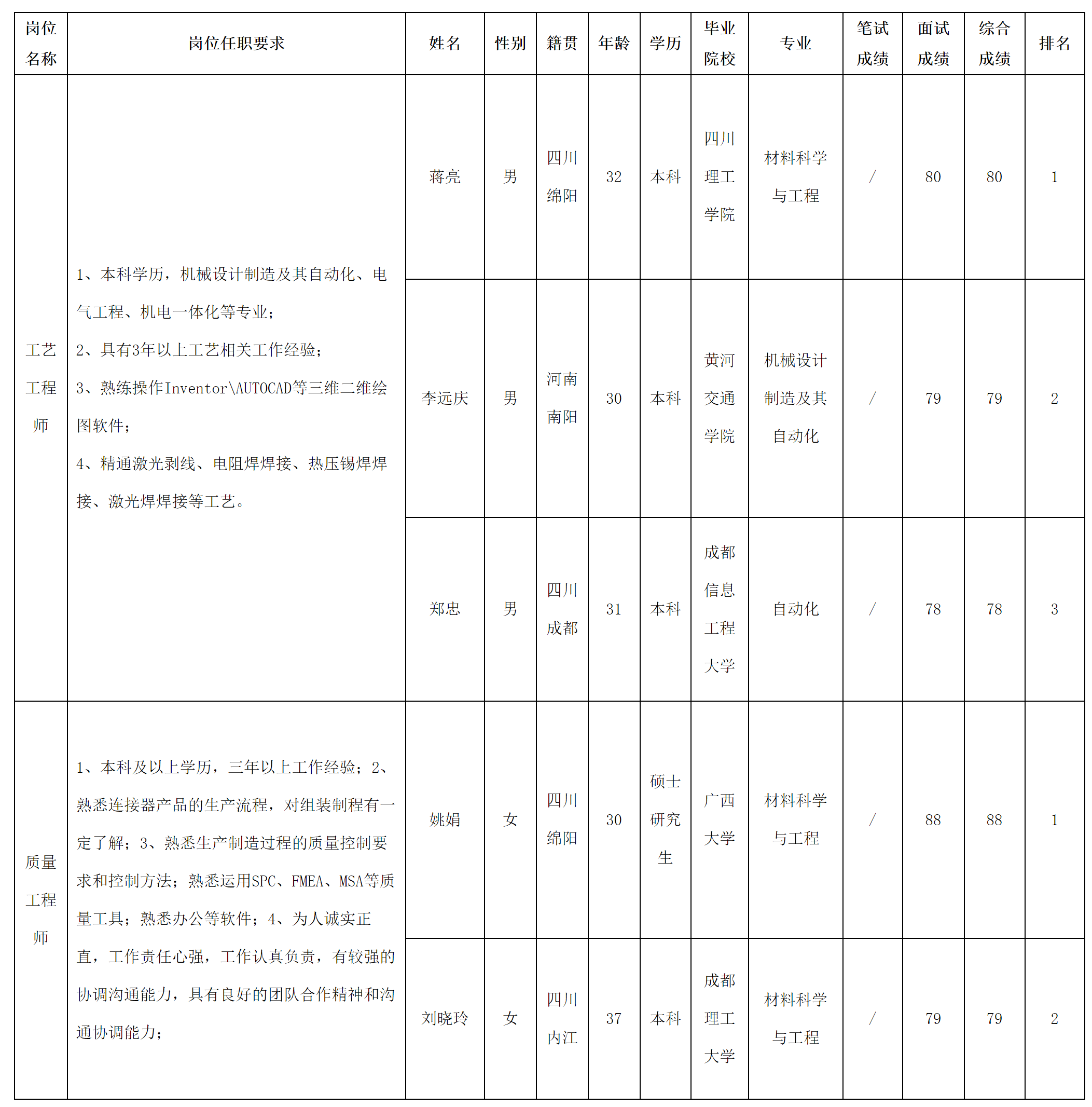 根据四川华丰科技股份有限公司发布的招聘公告及招聘相关规定,经面试等程序,现将测试成绩予以公示。