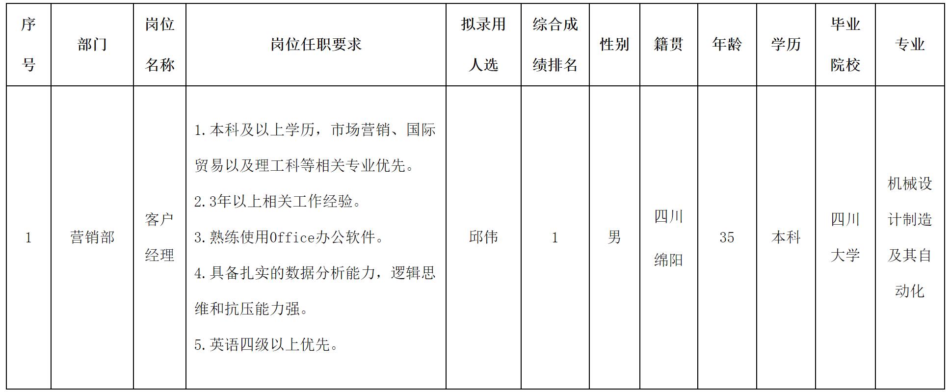 根据四川能创智电科技有限责任公司发布的招聘公告及招聘相关规定,经面试、考察、体检等程序,拟录用邱伟同志到公司工作,现予以公示,具体情况如下: