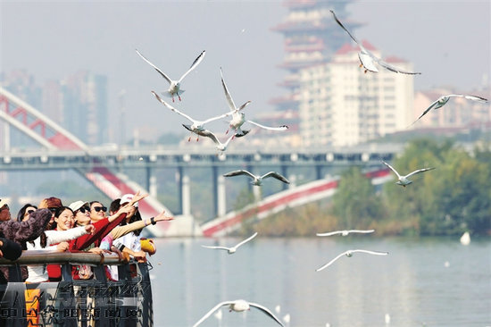 红嘴鸥与市民互动。