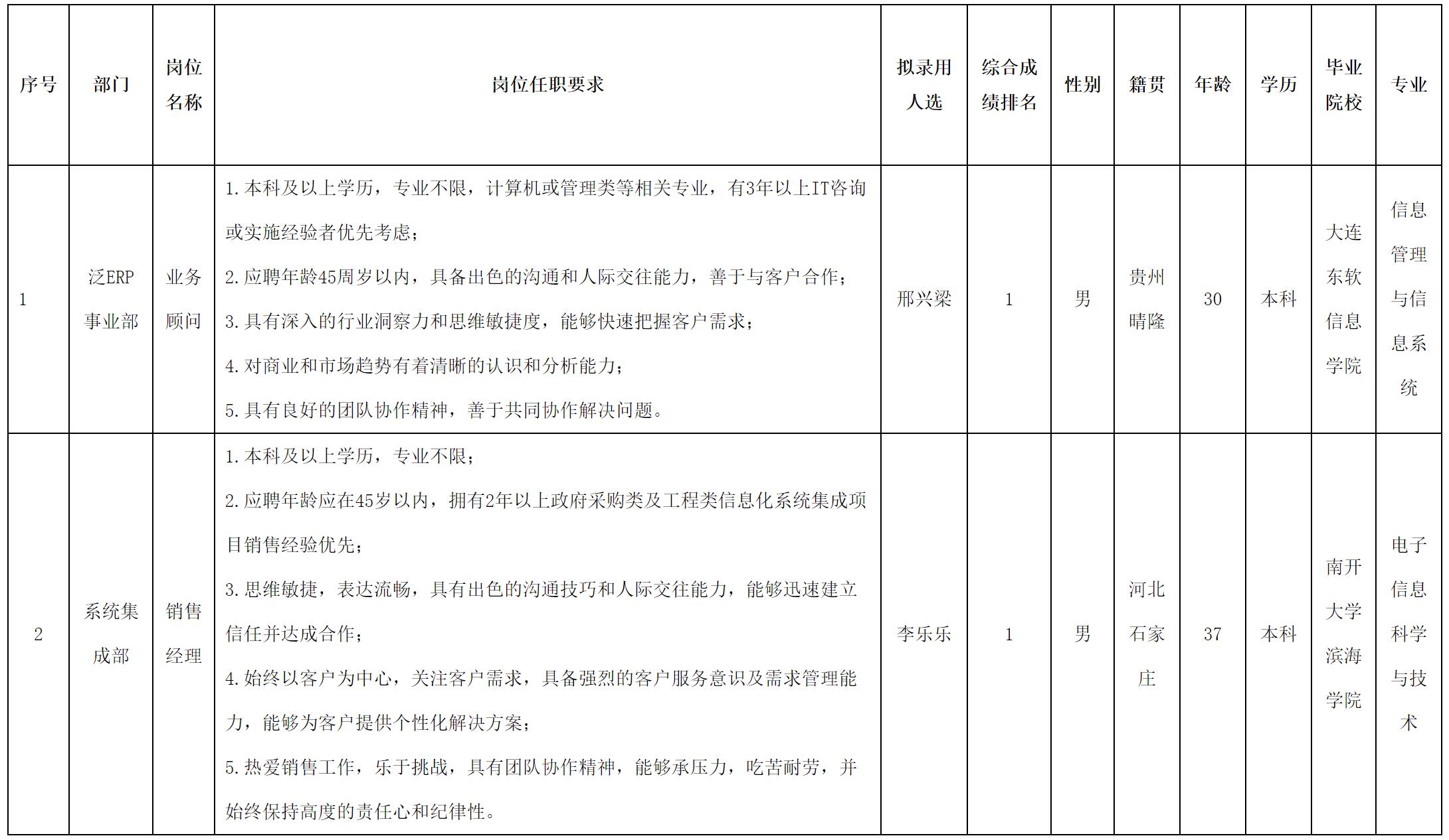 根据四川虹信软件股份有限公司发布的招聘公告及招聘相关规定,经测试、考察、体检等程序,拟录用邢兴梁、李乐乐同志到四川虹信软件股份有限公司工作,现予以公示,具体情况如下: