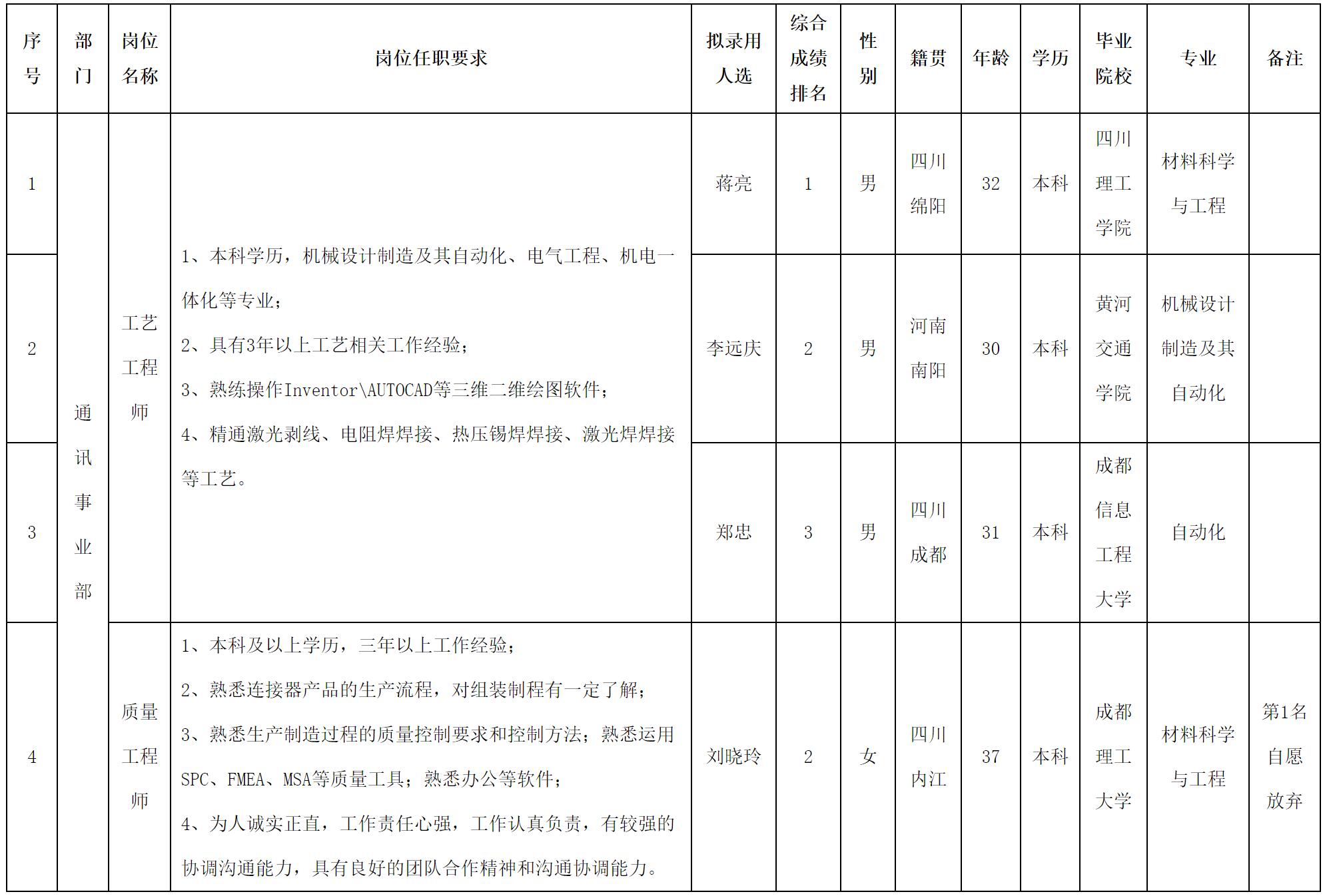 根据四川华丰科技股份有限公司发布的招聘公告及招聘相关规定,经测试等程序,拟录用蒋亮等同志到四川华丰科技股份有限公司工作,现予以公示,具体情况如下: